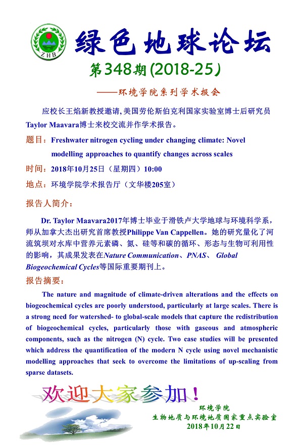 绿色地球论坛第348期(2018-25) ——环境刮刮卡 系列学术报告会 题目:Freshwater nitrogen cycling under changing climate: Novel modelling approaches to quantify changes across scales 时间:2018年10月25日(周四)上午10:00 地点:环境刮刮卡 学术报告厅(文华楼205室)