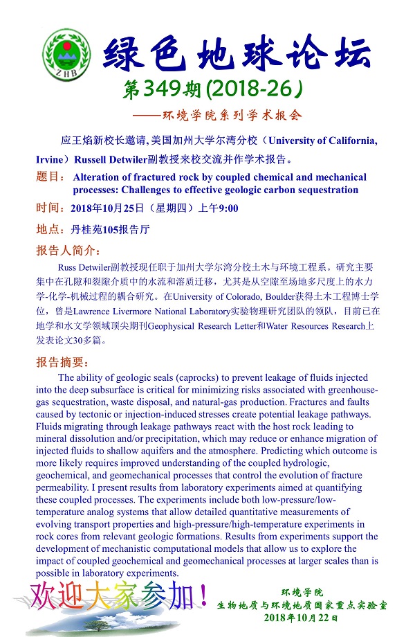 绿色地球论坛第349期(2018-26) ——环境刮刮卡 系列学术报告会 题目:Alteration of fractured rock by coupled chemical and mechanical processes: Challenges to effective geologic carbon sequestration 时间:2018年10月25日(周四)上午9:00 地点:丹桂苑105报告厅