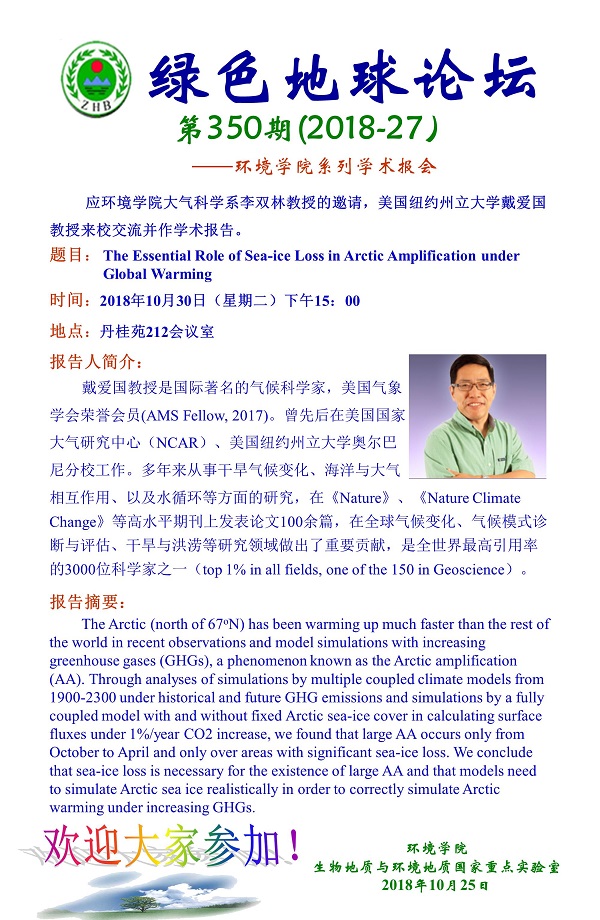 绿色地球论坛第350期(2018-27) ——环境刮刮卡 系列学术报告会 题目:The Essential Role of Sea-ice Loss in Arctic Amplification under Global Warming 时间:2018年10月30日(周二)下午15:00 地点:丹桂苑212室
