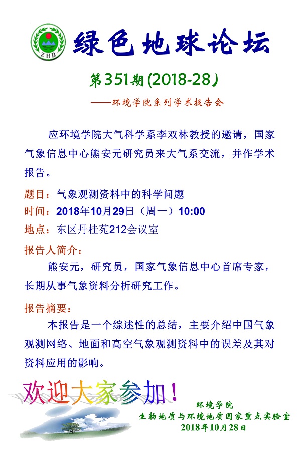 绿色地球论坛第351期(2018-28) ——环境刮刮卡 系列学术报告会 题目:气象观测资料中的科学问题 时间:2018年10月29日(周一)上午10:00 地点:丹桂苑212室