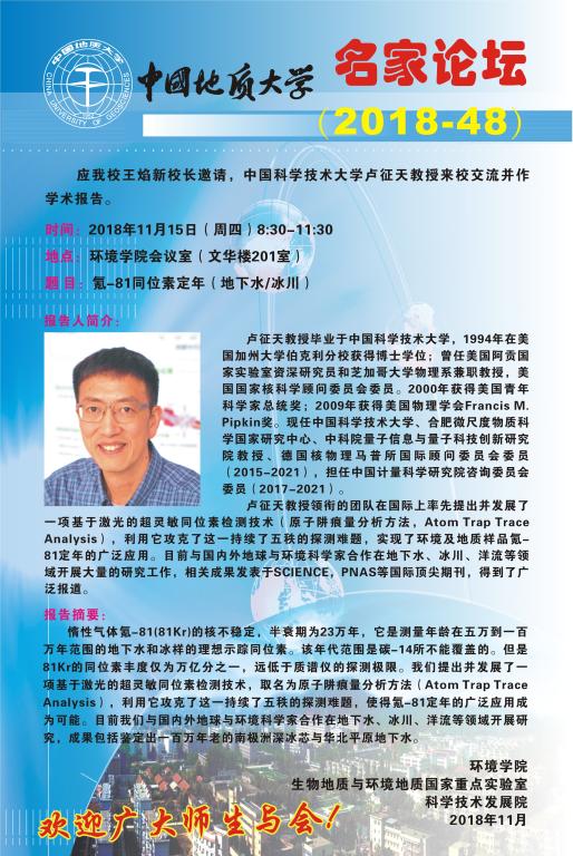 名家论坛(2018-48) 题目:氪-81同位素定年(地下水/冰川) 时间:2018年11月15日(周四)8:30—11:30 地点:环境刮刮卡 会议室(文华楼201室)