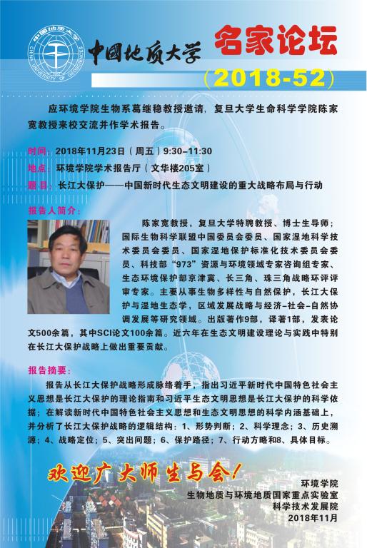 名家论坛(2018-52) 题目:长江大保护——中国新时代生态文明建设的重大战略布局与行动 时间:2018年11月23日(周五)9:30—11:30 地点:环境刮刮卡 学术报告厅(文华楼205室)