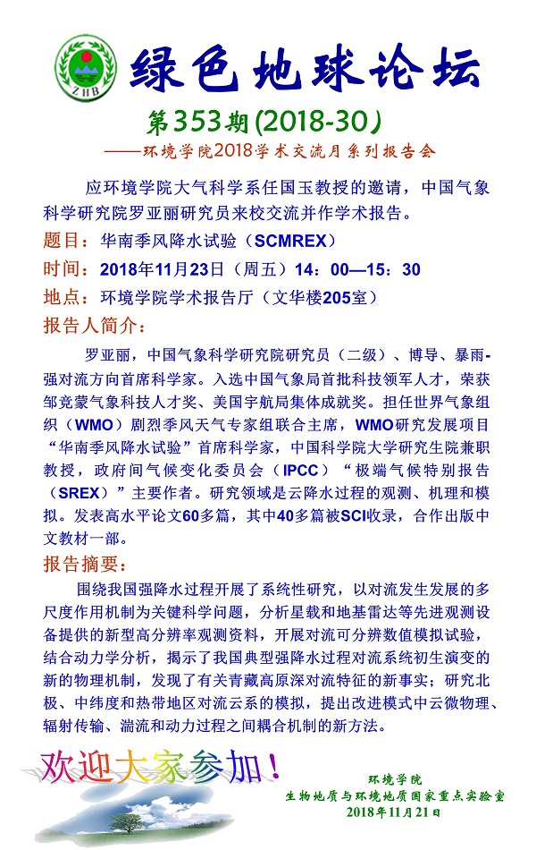 绿色地球论坛第353期(2018-30) ——环境刮刮卡 2018学术交流月系列报告会 题目:华南季风降水试验(SCMREX) 时间:2018年11月23日(周五)14:00—15:30 地点:环境刮刮卡 学术报告厅(文华楼205室)