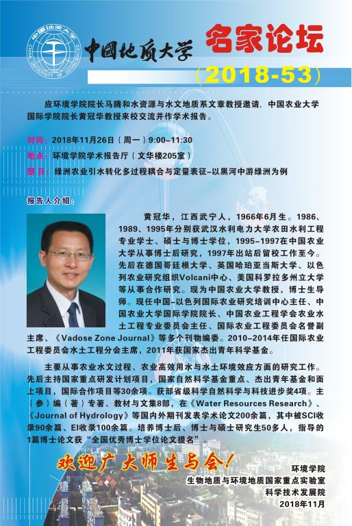 名家论坛(2018-53) 题目:绿洲农业引水转化多过程耦合与定量表征-以黑河中游绿洲为例 时间:2018年11月26日(周一)9:00—11:30 地点:环境刮刮卡 学术报告厅(文华楼205室)