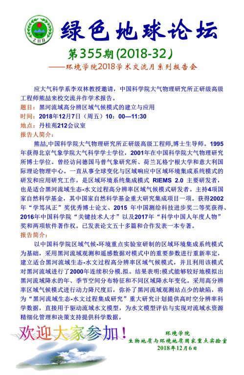 绿色地球论坛第355期(2018-32) ——环境刮刮卡 2018学术交流月系列报告会 题目:黑河流域高分辨区域气候模式的建立与应用 时间:2018年12月7日(周五)10:00—11:30 地点:丹桂苑212会议室