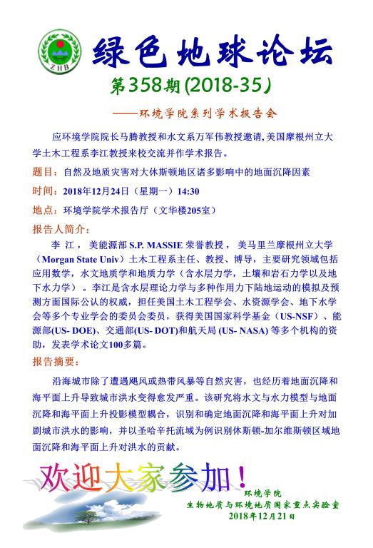 绿色地球论坛第358期(2018-35) ——环境刮刮卡 系列学术报告会 题目:自然及地质灾害对大休斯顿地区诸多影响中的地面沉降因素 时间:2018年12月24日(周一)14:30 地点:环境刮刮卡 学术报告厅(文华楼205室)