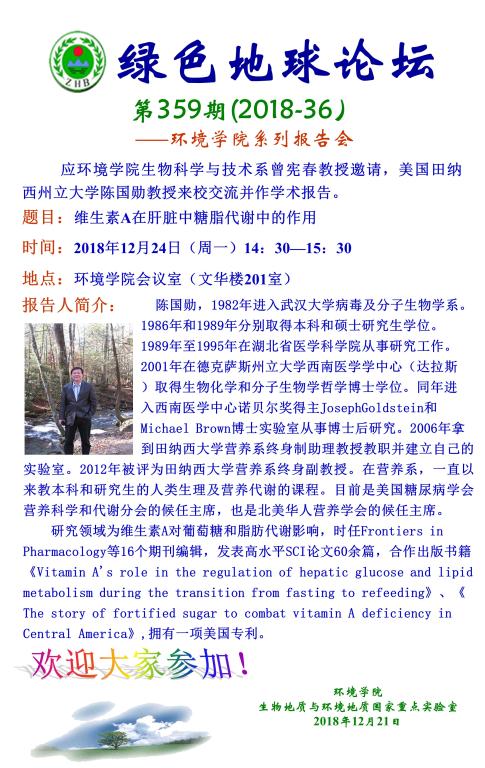 绿色地球论坛第359期(2018-36) ——环境刮刮卡 系列学术报告会 题目:维生素A在肝脏中糖脂代谢中的作用 时间:2018年12月24日(周一)14:30 地点:环境刮刮卡 会议室(文华楼201室)