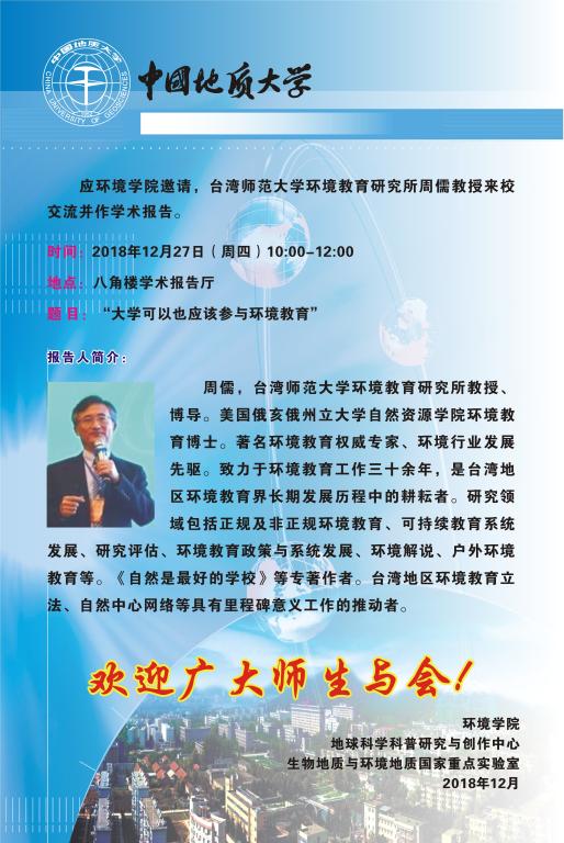 题目:刮刮卡 可以也应该参与环境教育 时间:2018年12月27日(周四)10:00—12:00 地点:八角楼学术报告厅