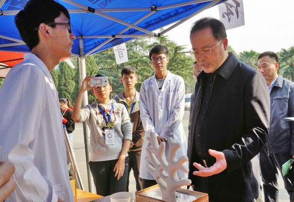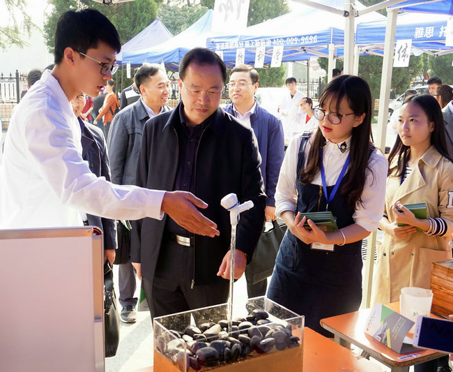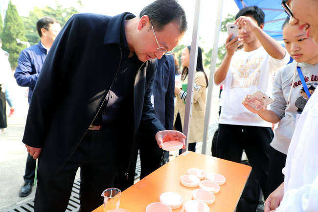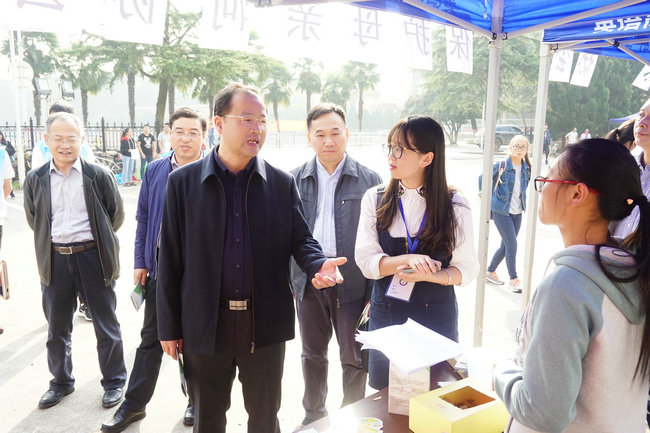 第十三届环境文化科技节科普体验日在西区体育馆启动。校党委书记何光彩参观环境文化科技节科普体验展。