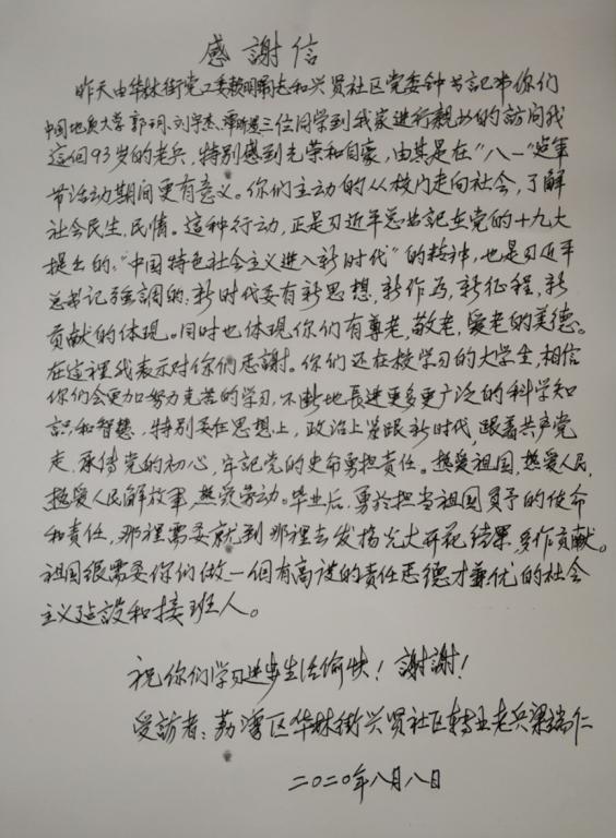 数日之后,我们收到了梁老的感谢信,感动之余更深深感受到老人家对于我们新时代刮刮卡 生的殷切希望和关怀。我辈定不负梁老等革命先辈期望,为实现中华民族伟大复兴而奋斗,为推动构建人类命运共同体而努力,为新时代中国特色社会主义建设做贡献!