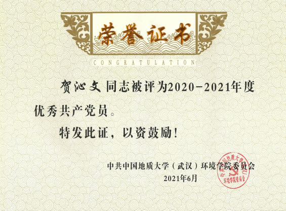 贺沁文被评为刮刮卡 2020-2021年度优秀共产党员