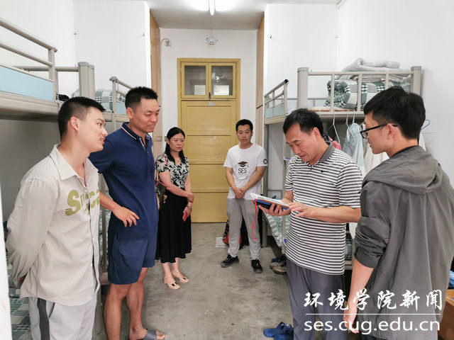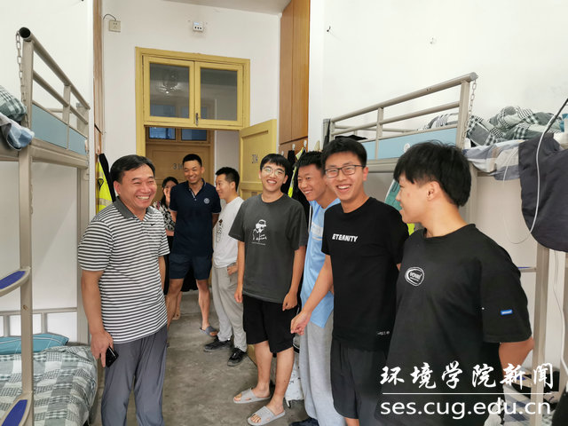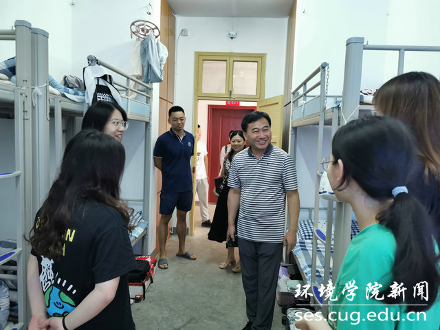 座谈会前,李素矿一行走进宿舍看望实习学生,与学生亲切交谈,问询学生野外实习期间的学习生活收获,查阅同学们的野外实习记录薄。他鼓励同学们一定要珍惜野外实习机会,在野外实习实践中提升理论认知水平、专业操作技能,涵养热爱自然、尊重自然、敬畏自然的情怀,并叮嘱学生一定要注意安全,做好防暑降温、疫情防护。
