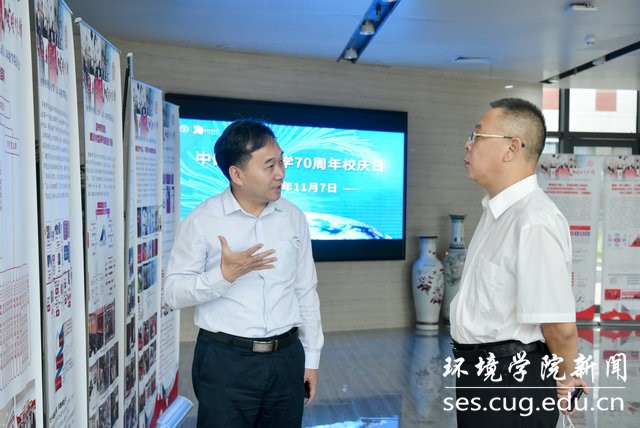 在三楼荣誉展前,唐忠阳驻足观看并询问有关情况,李素矿一一回答。