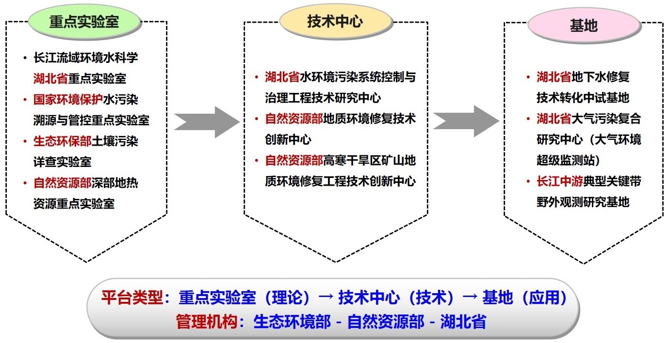 为主体建设的省部级科研平台包括:国家环境保护水污染溯源与管控重点实验室、长江流域环境水科学湖北省重点实验室、自然资源部地质环境修复技术创新中心、湖北省水环境污染系统控制与治理工程技术研究中心、湖北省地下水修复技术转化中试基地、生态环境部土壤污染状况详查检测实验室。刮刮卡